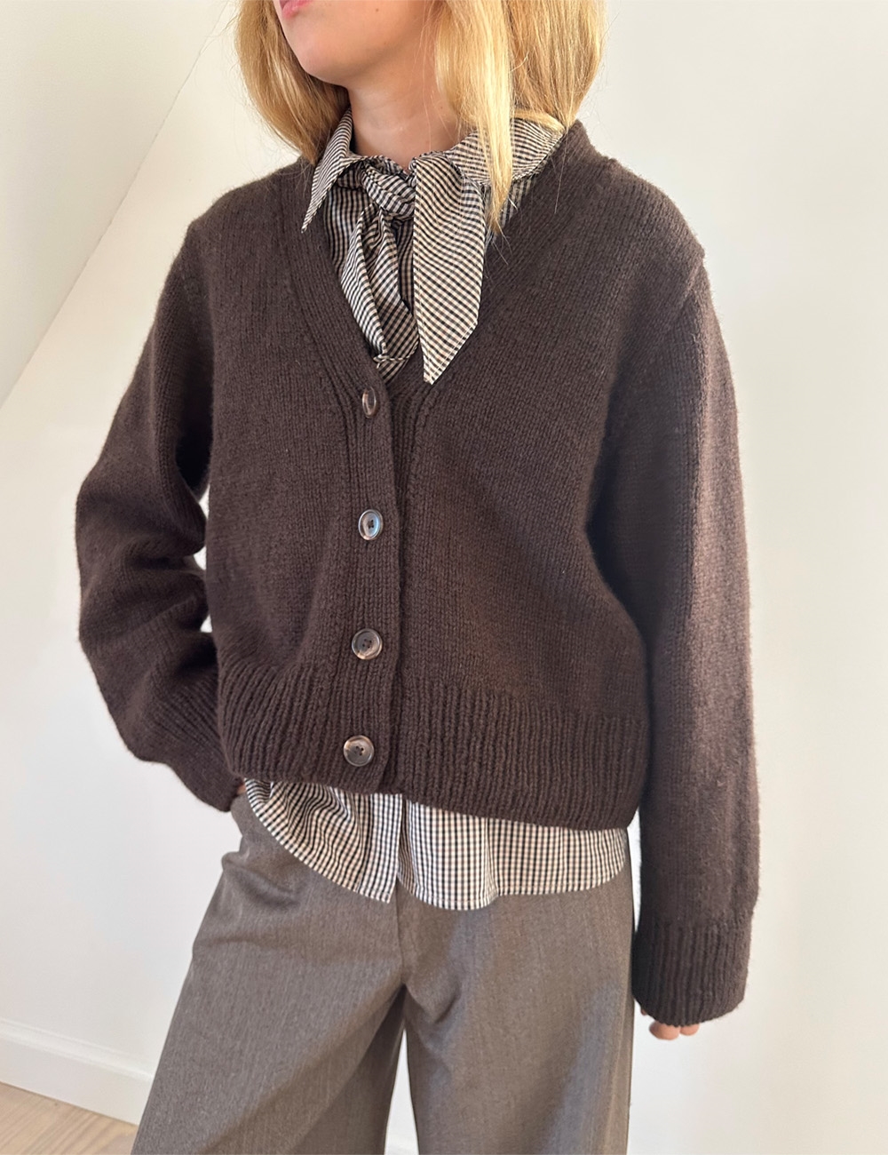 Man begynner med bakstykkets øverste del, deretter strikkes øverste del av forstykkene ut fra ryggens skrå skuldre. Etter det strikkes det opp masker til toppen av ermet og herfra strikkes ermer, forstykker og bakstykket samtidig til slutten av ermehullet. Herfra strikkes bakstykke/forstykker og ermer ferdig hver for seg. Til slutt strikkes den loddrette ribbkanten langs forkantene og v-halsen. Ribbkanten strikkes fast underveis, altså samtidig med at den strikkes.