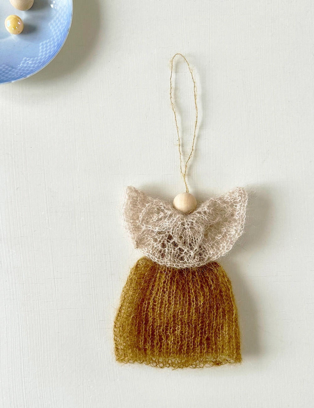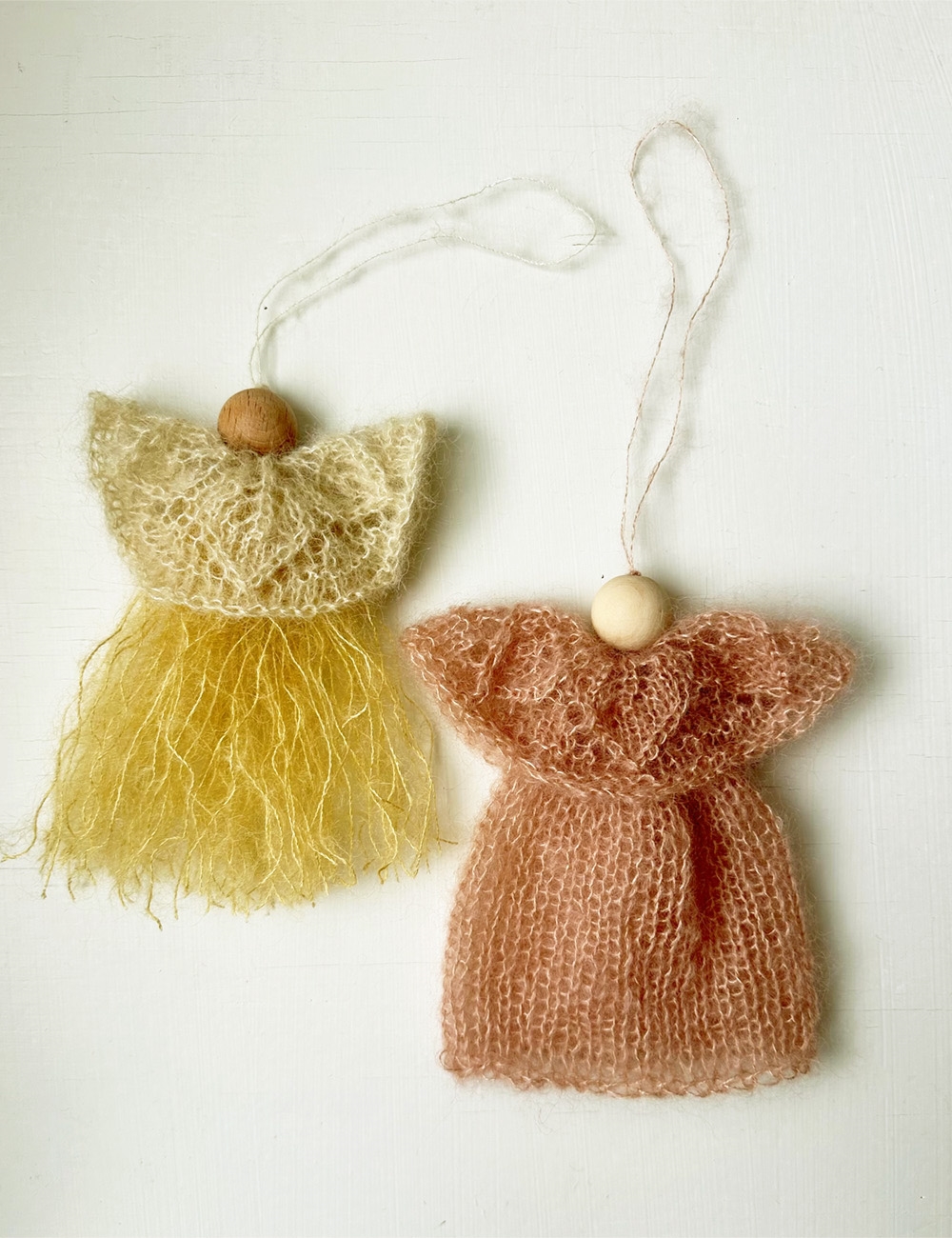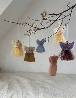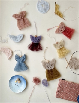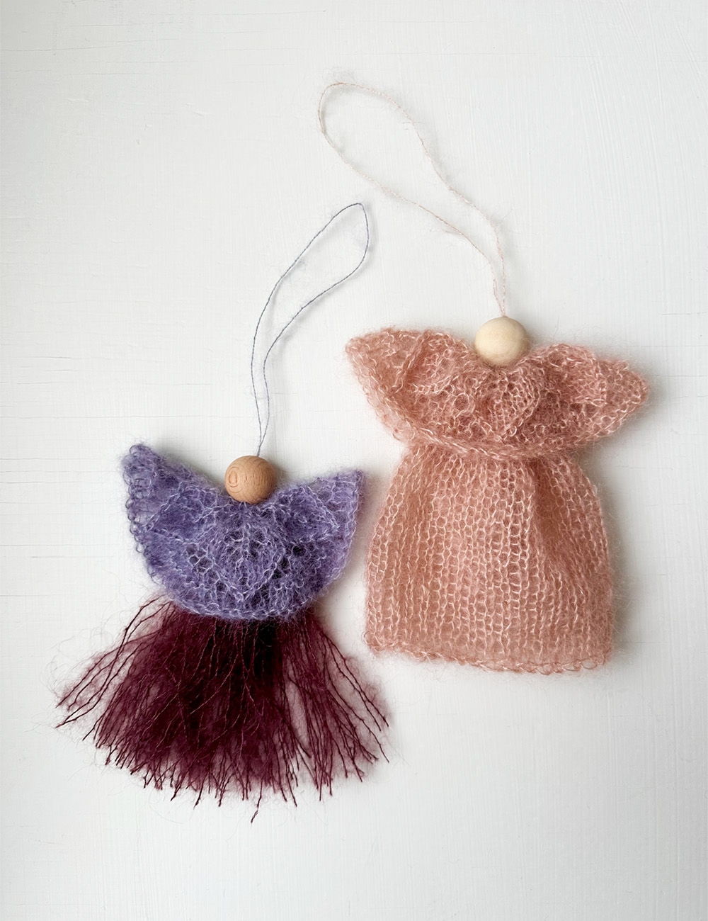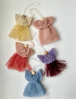 Silk mohair (25 g = approx. 210 m): One angel takes up approx. 2 g for the wings and approx. 2 g for the skirt (yarn quantity is the same for both types of skirts).