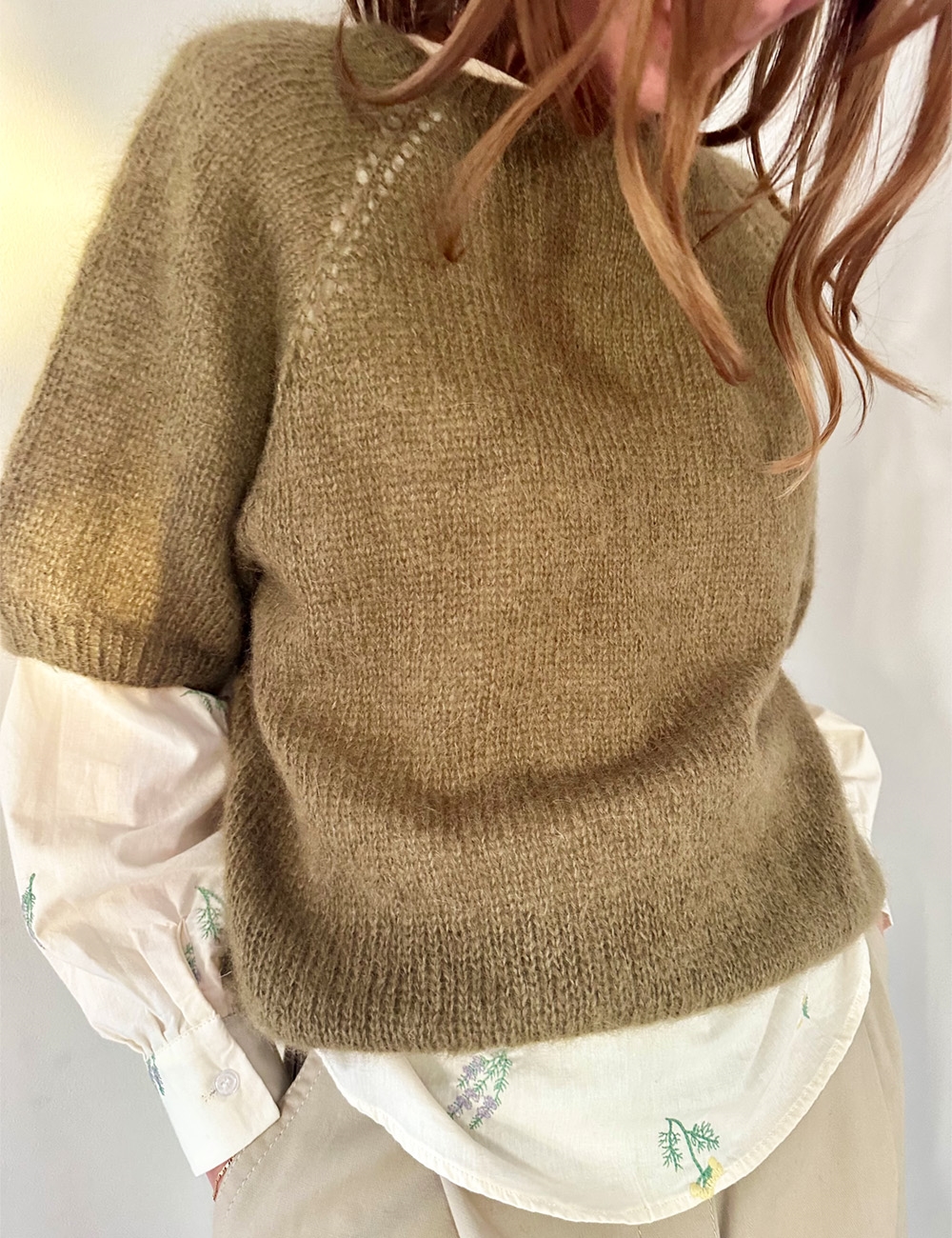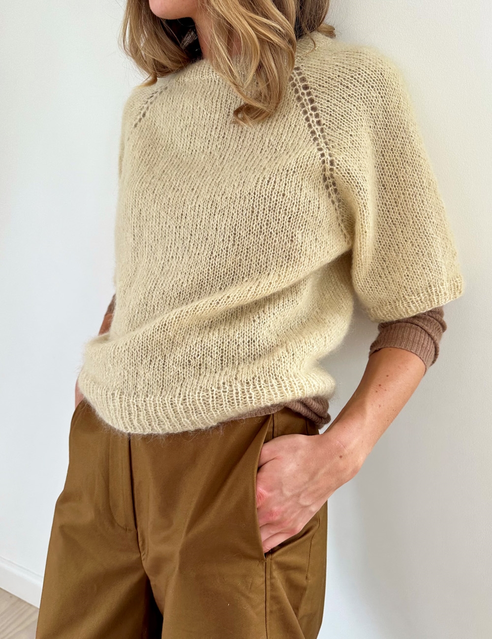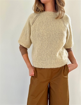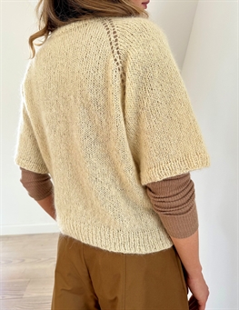 18 puntos x 24 vueltas a punto jersey con doble hebra = 10 x 10 cm con agujas de 5 mm. Notas sobre la construcción La blusa se teje por completo a doble hebra, de arriba a abajo y con aumentos raglán. El escote es igual por delante y por detrás. Los aumentos raglán con lazada forman una línea de calados a cada lado de los pts raglán. Atención: Para las tallas 2XL y 3XL: En la parte inferior del canesú, los aumentos sólo se hacen en el cuerpo. Por tanto, solo se creará un calado a lo largo de los aumentos raglán.