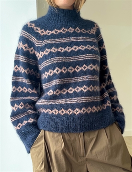 Der Mikala Sweater wird von oben nach unten gearbeitet. Das Bündchen am Halsausschnitt erfolgt zuletzt. Zuerst wird der einfarbige Teil gestrickt, wobei der Halsausschnitt mit verkürzten Reihen geformt wird. Zuerst an den Ärmeln, danach auf beiden Seiten der Vorderseite. Gleichzeitig mit den verkürzten Reihen werden Raglanzunahmen vorgenommen. Danach wird die Passe in Runden mit Muster und Raglanzunahmen gestrickt, bevor Rumpf und Ärmel separat fertiggestellt werden, d.h., das Muster wird nur in den Hinreihen gearbeitet.