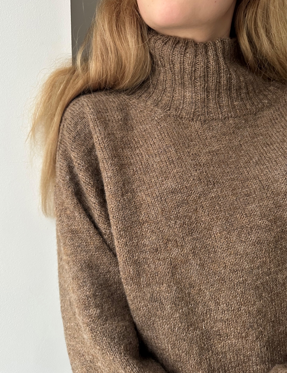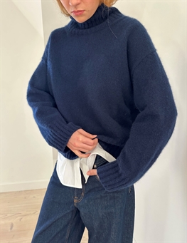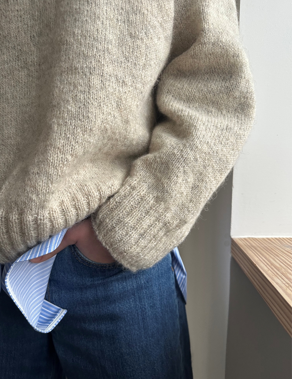 Note Sweater er tænkt til at have et bevægelsesrum (positive ease) på 20-30 cm. Strikker du i meget let garn, som f.eks. Einrum Lamb 2, anbefaler jeg mindre bevægelsesrum end i f.eks. Hjelholt Dansk Pelsuld 8/2, der er lidt tungere og mere fyldigt. Den navy og den lys brune sweater er her vist med et bevægelsesrum på ca. 28 cm. Den lyse sweater er vist med et bevægelsesrum på ca. 36 cm.