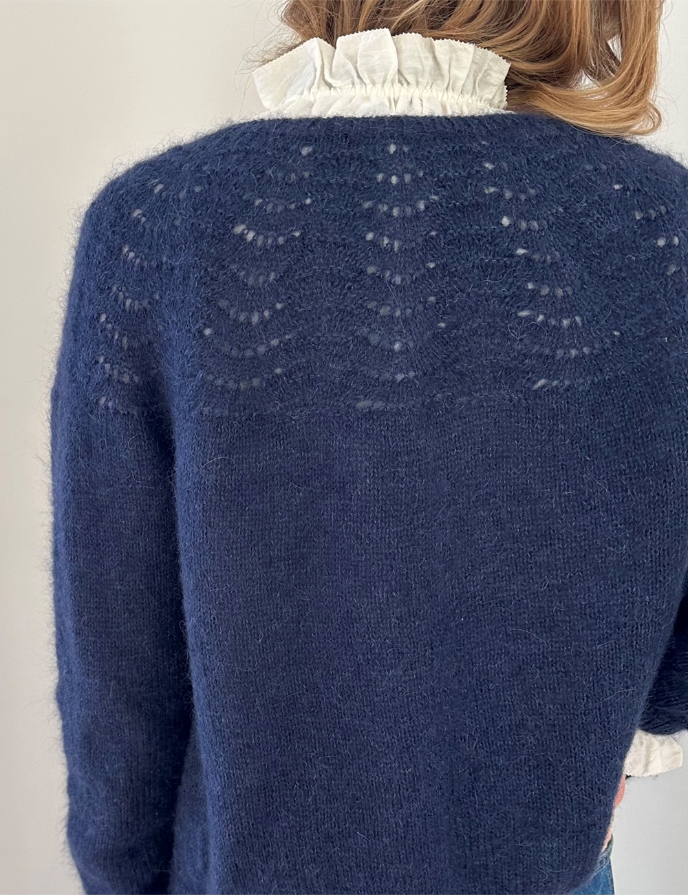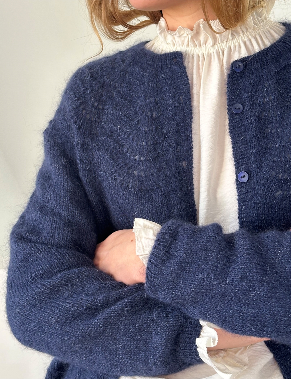 Peacock Cardigan fine er tænkt til at have et bevægelsesrum på ca. 10-16 cm. På billederne er den vist med et bevægelsesrum på ca. 13 cm. Find din personlige overvidde ved at måle dig om brystet (eller overkroppens største mål). Se derefter på målene først i opskriften (dette er cardiganens færdige mål). Bevægelsesrum (positive ease) er forskellen mellem dit personlige mål og cardiganens mål. Er din overvidde f.eks. 94 cm, vil en str. M give dig et bevægelsesrum på 9 cm (103 – 94 cm = 9 cm).